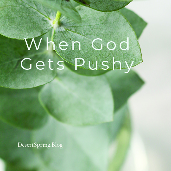 I tend to avoid pushy people. They ruffle my feathers. But when God gets pushy, . . . I’ve learned that I’d best pay attention. I know I’m not going to win that fight.